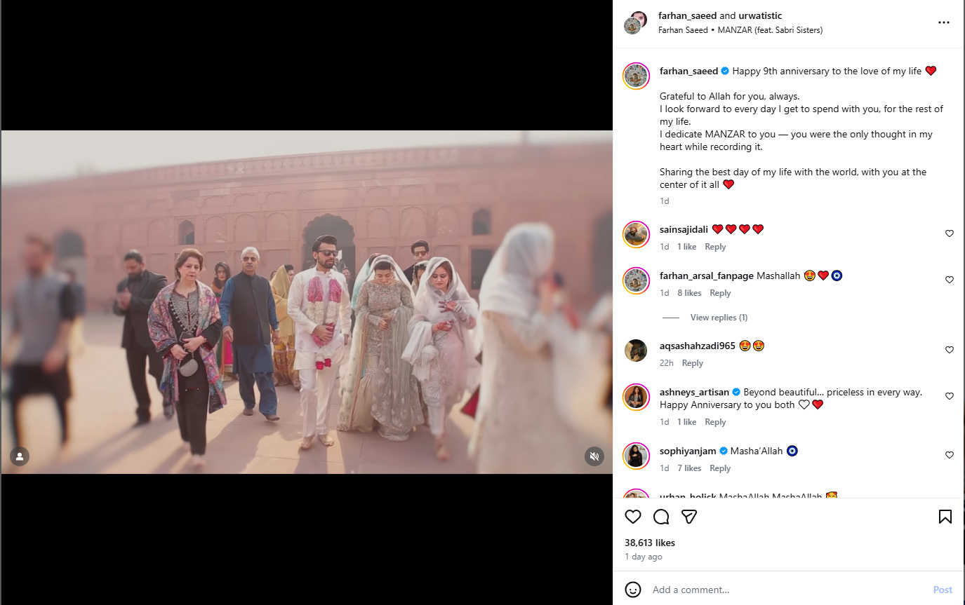 فرحان سعید نے انسٹاگرام پر جذباتی پیغام شیئر کرتے ہوئے لکھا کہ زندگی کی محبت کو نویں سالگرہ مبارک، اللّٰہ کا شکر ادا کرتا ہوں کہ تم میری زندگی میں ہو، باقی دن تمہارے ساتھ گزارنے کا منتظر ہوں۔ منظر میں تم میرے دل کی سب سے بڑی سوچ تھی۔