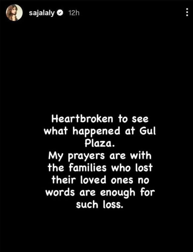 اداکارہ سجل علی نے گل پلازہ میں ہونے والے جانی نقصان پر گہرے دکھ کا اظہار کرتے ہوئے کہا کہ اس طرح کے نقصان کیلئے الفاظ ناکافی ہیں اور انکی دعائیں سوگوار خاندانوں کے ساتھ ہیں، اداکار و گلوکار