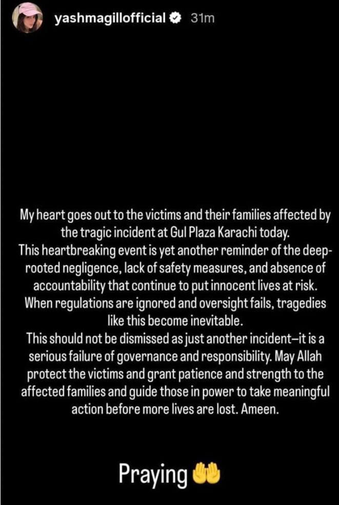 اداکارہ منال خان نے گل پلازہ سے جڑی اپنی یادوں کو تازہ کرتے ہوئے سانحے پر افسوس کا اظہار کیا، منال خان نے کراچی کی صورتحال پر تنقید کرتے ہوئے کہا کہ ملک کا معاشی مرکز ہونے کے باوجود یہ شہر مسلسل نظر انداز ہورہا ہے، اداکارہ صبور علی نے بھی اس سانحے پر ردعمل دیتے ہوئے اللّٰہ سے رحم کی دعا کی اور کہا کہ یہ دکھ الفاظ میں بیان نہیں کیا جاسکتا۔