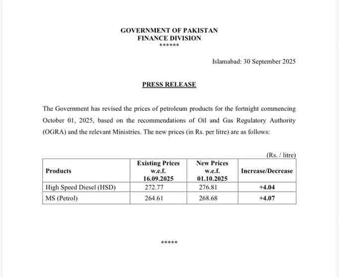 اعلان کے مطابق پیٹرول کی قیمت میں 4 روپے 7 پیسے فی لٹر کا اضافہ کیا گیا ہے جس کے بعد نئی قیمت 264 روپے 61 پیسے سے بڑھ کر 268 روپے 68 پیسے فی لٹر مقرر کر دی گئی۔ اسی طرح ہائی اسپیڈ ڈیزل کی قیمت بھی 4 روپے 4 پیسے فی لٹر بڑھا دی گئی ہے، جس کے بعد اس کی نئی قیمت 272 روپے 77 پیسے سے بڑھ کر 276 روپے 81 پیسے فی لٹر ہو گئی۔ وزارت خزانہ نے وضاحت کی کہ نئی قیمتوں کا اطلاق گزشتہ رات 12 بجے سے کر دیا گیا ہے۔