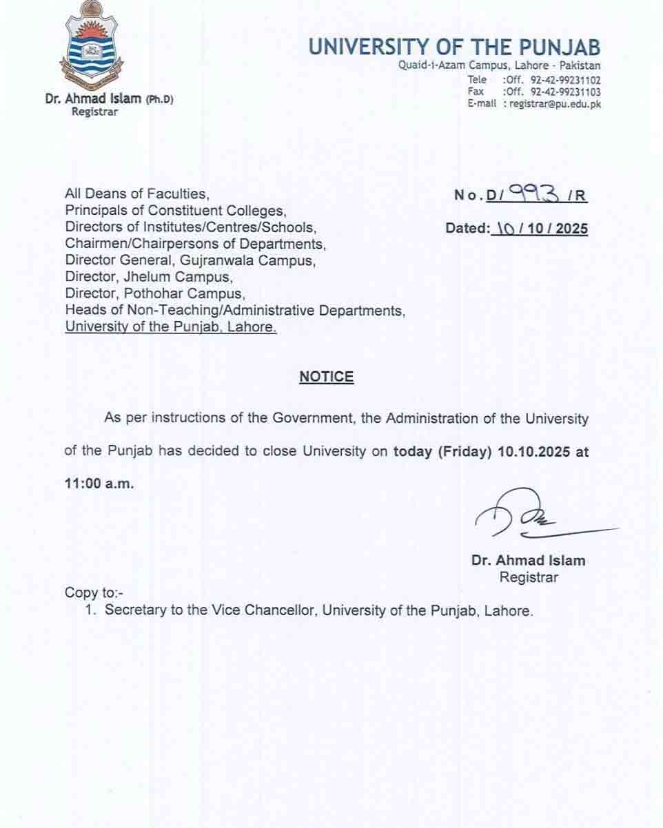 ضلعی انتظامیہ کی ہدایت پر پنجاب یونیورسٹی میں آج کے دن چھٹی کا اعلان کردیا گیا،جبکہ جامعہ میں ہونے والے تمام امتحانات بھی ملتوی کردیے گئے ہیں۔