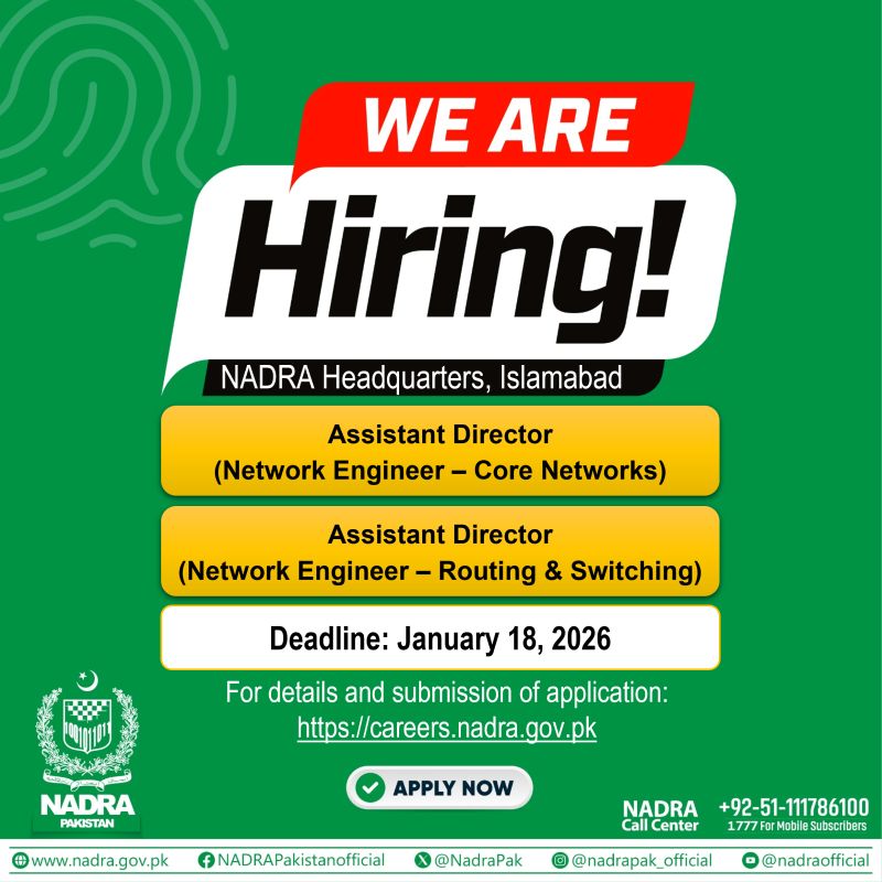 نادرا کی جانب سے دو اہم اسامیوں پر بھرتی کی جا رہی ہے جن میں اسسٹنٹ ڈائریکٹر (نیٹ ورک انجینئر – کور نیٹ ورکس) اور اسسٹنٹ ڈائریکٹر (نیٹ ورک انجینئر – روٹنگ اینڈ سوئچنگ) شامل ہیں۔