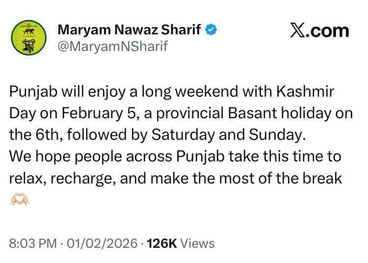 وزیراعلیٰ پنجاب مریم نواز شریف نے سماجی رابطے کی ویب سائٹ ایکس (سابقہ ٹوئٹر) پر اپنے پیغام میں بتایا کہ 5 فروری کو یومِ کشمیر کے موقع پر صوبے بھر میں عام تعطیل ہوگی، جبکہ 6 فروری کو صوبائی سطح پر بسنت کی تعطیل دی جائے گی۔ ان تعطیلات کے بعد ہفتہ اور اتوار کی چھٹیاں بھی شامل ہوں گی، جس کے نتیجے میں عوام کو مسلسل کئی دنوں کی چھٹی میسر آئے گی۔
