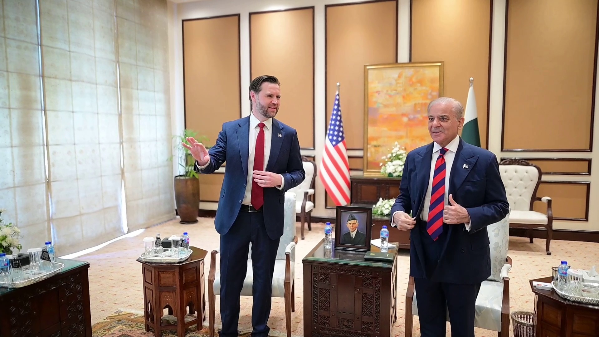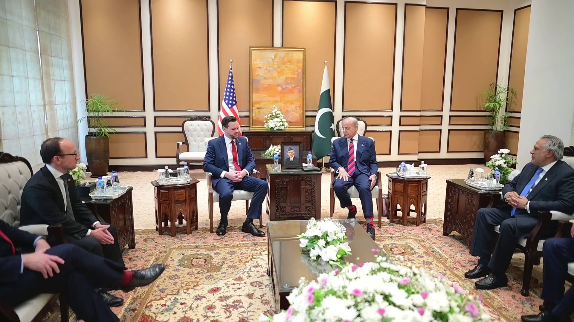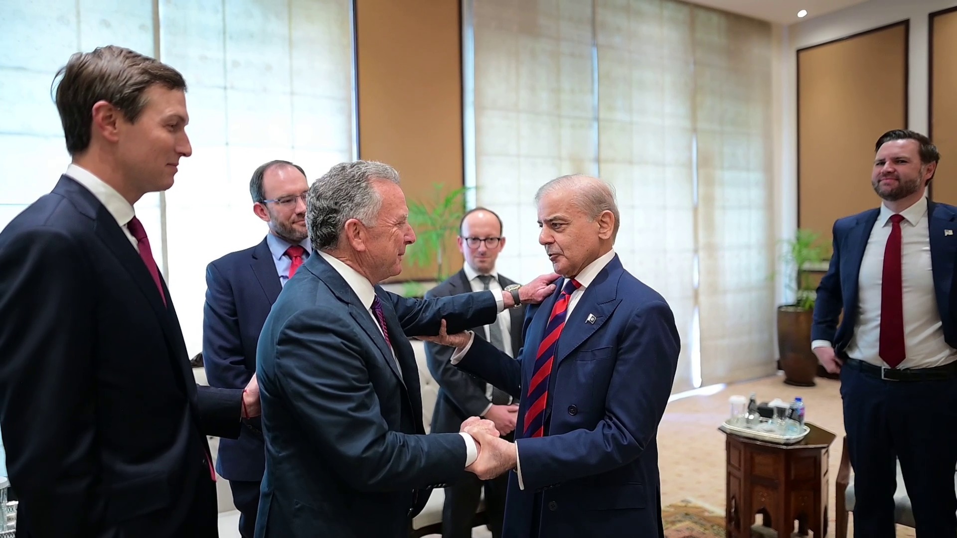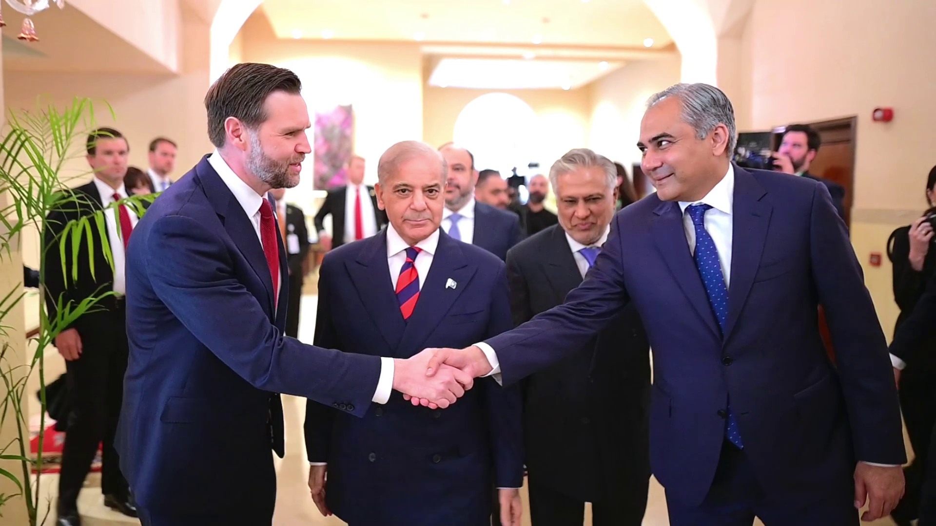 تفصیلات کے مطابق پاکستان کے وزیرِاعظم شہباز شریف اور امریکہ کے نائب صدر جے ڈی وینس کی ملاقات کے موقع پر خصوصی ایلچی اسٹیو وٹکوف اور جیرڈ کشنر بھی موجود تھے۔ وزیرِ اعظم کے ہمراہ نائب وزیرِاعظم و وزیرِ خارجہ سینیٹر محمد اسحاق ڈار اور وزیرِ داخلہ سینیٹر سید محسن رضا نقوی موجود تھے۔