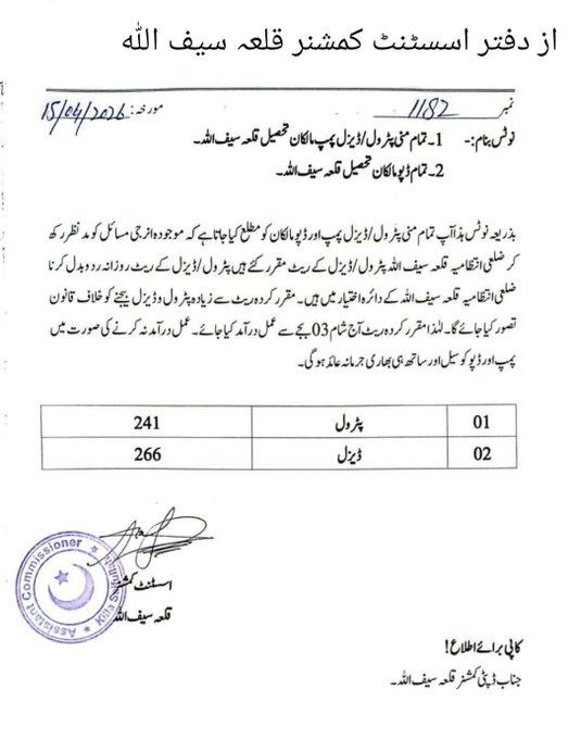 سوشل میڈیا پر وائرل ہونے والے نوٹیفکیشن کے مطابق اسسٹنٹ کمشنر قلعہ سیف اللّٰہ کے نام سے جاری دستاویز میں پیٹرول کی قیمت 241 روپے فی لیٹر جبکہ ڈیزل کی قیمت 266 روپے فی لیٹر مقرر کی گئی ہے۔ دستاویز میں یہ بھی کہا گیا ہے کہ تمام پمپ مالکان کو ہدایت دی گئی ہے کہ وہ انہی نرخوں پر ایندھن فروخت کریں، بصورت دیگر ان کے خلاف قانونی کارروائی عمل میں لائی جائے گی۔ اس کے علاوہ انتظامیہ کی جانب سے اس امر کو یقینی بنانے کے لیے نگرانی کے اقدامات کا بھی ذکر کیا گیا ہے۔