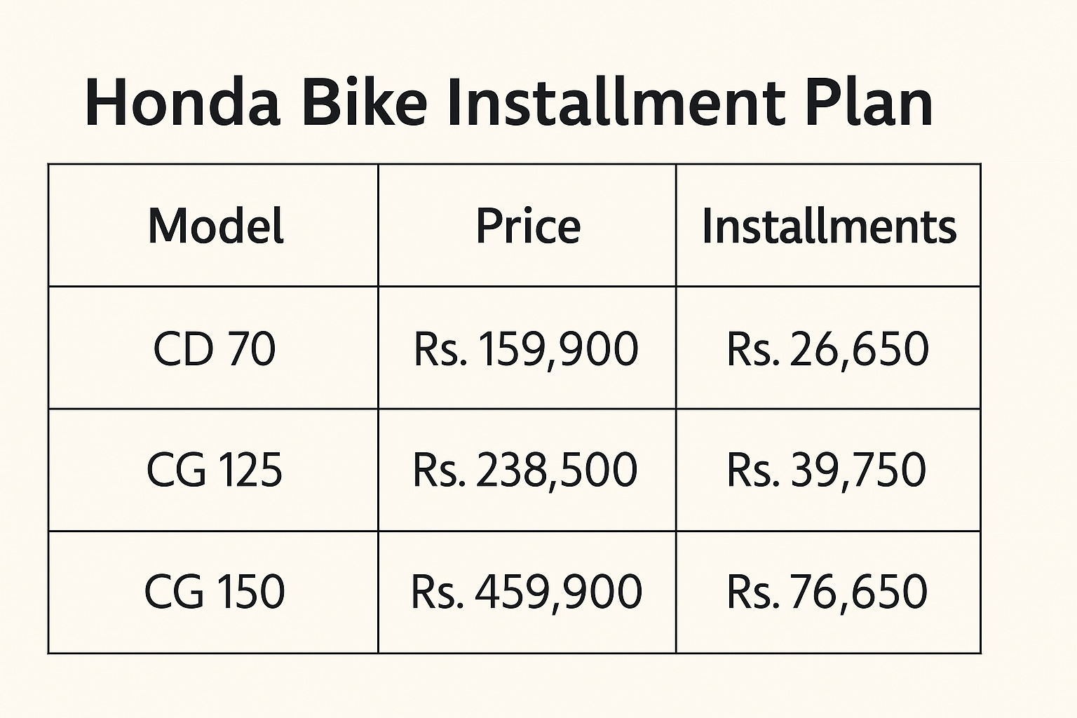 بینک کی جانب سے جاری تفصیلات کے مطابق ہونڈا کے تین مقبول CD 70، CG 125 اور CG 150 کو کریڈٹ کارڈ کے ذریعے بغیر کسی سود کے فنانس کیا جا سکتا ہے۔ CD 70 کی قیمت ایک لاکھ 59 ہزار 900 روپے مقرر کی گئی ہے، جس کی ماہانہ قسط 26 ہزار 650 روپے ہو گی۔ اسی طرح CG 125 کی قیمت 2 لاکھ 38 ہزار 500 روپے ہے، جس پر 39 ہزار 750 روپے ماہانہ قسط ادا کرنا ہو گی، جبکہ CG 150 کی قیمت 4 لاکھ 59 ہزار 900 روپے رکھی گئی ہے اور اس کی ماہانہ قسط 76 ہزار 650 روپے مقرر کی گئی ہے۔