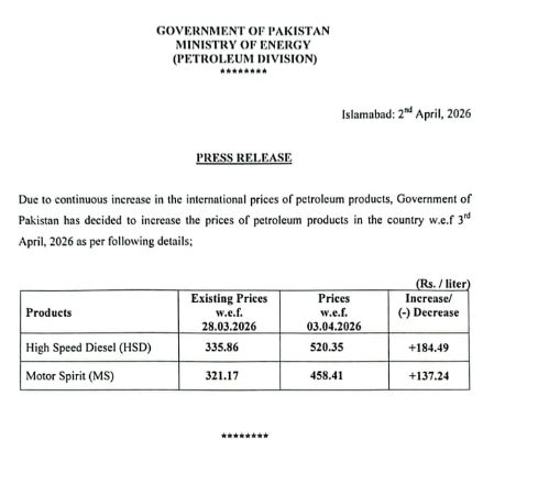 حکومت کی جانب سے پٹرول کی قیمت میں 137 روپے 23 پیسے فی لٹر کا اضافہ کر دیا گیا، نرخوں میں اضافے کے بعد پٹرول کی نئی قیمت 458 روپے 40 پیسے فی لٹر جبکہ ڈیزل کی قیمت 184 روپے 49 پیسے فی لٹر اضافہ کے بعد 520 روپے 35 پیسے فی لٹر مقرر کی گئی ہے۔