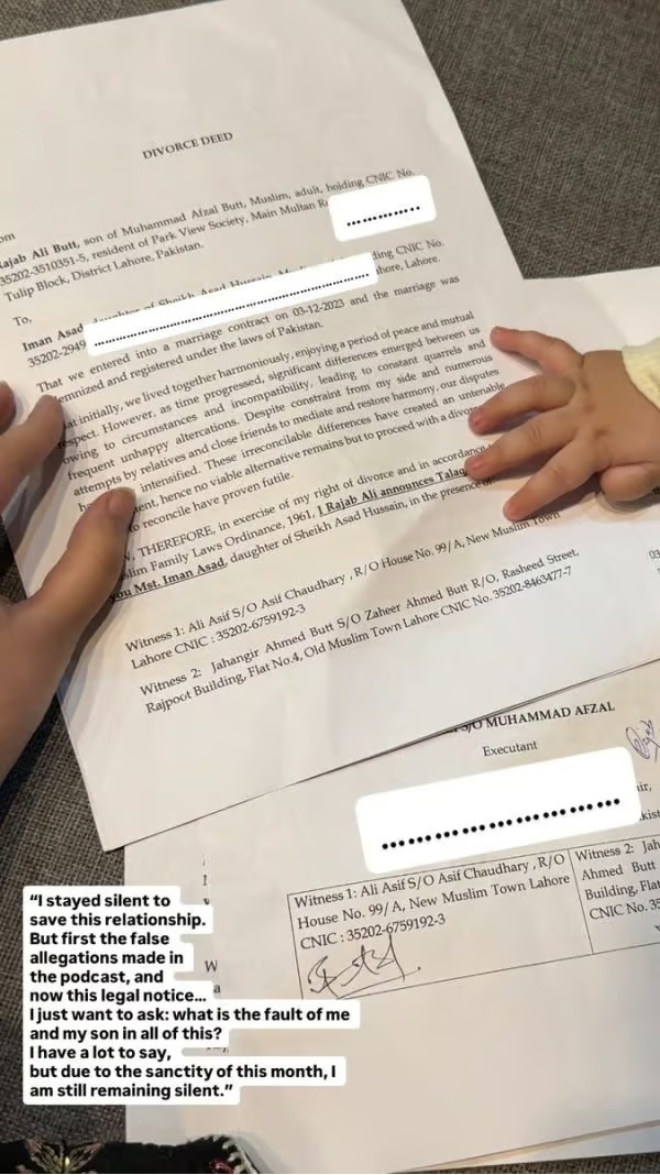 طلاق نامہ وائرل ہونے کے بعد ایمان اسد نے بھی سوشل میڈیا پر ایک بیان جاری کرتے ہوئے اس معاملے پر اپنی خاموشی توڑی۔ انہوں نے اپنے پیغام میں مایوسی کا اظہار کرتے ہوئے کہا کہ میں نے اس رشتے کو بچانے کے لیے خاموشی اختیار کی۔ لیکن پہلے پوڈکاسٹ میں لگائے گئے جھوٹے الزامات اور اب یہ قانونی نوٹس، میں صرف یہ پوچھنا چاہتی ہوں کہ اس سب میں میرا اور میرے بیٹے کا کیا قصور ہے ؟ میرے پاس کہنے کو بہت کچھ ہے، لیکن اس مقدس مہینے کی حرمت کی وجہ سے ابھی بھی خاموش ہوں۔