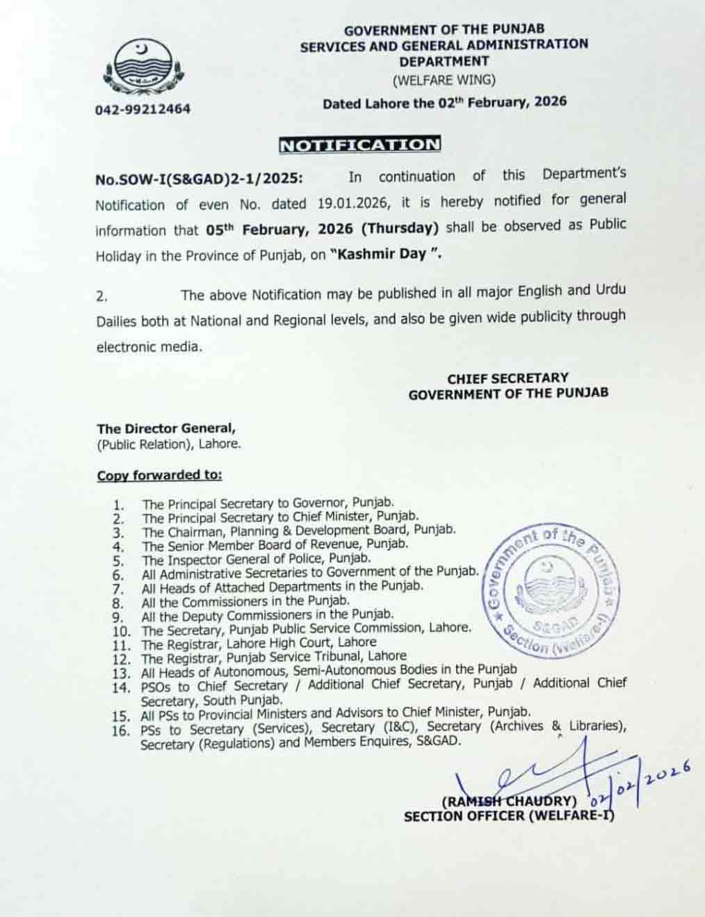 تعطیلات کے دوران سرکاری و نیم سرکاری دفاتر، تعلیمی ادارے اور بیشتر سرکاری ادارے بند رہیں گے۔ محکمہ سروسز اینڈ جنرل ایڈمنسٹریشن کی جانب سے جاری کیے گئے نوٹیفکیشن میں اس بات کی وضاحت کی گئی ہے کہ اس دن ملک بھر میں کشمیر کے مسئلے کے بارے میں یکجہتی کے اظہار کے لیے مختلف تقریبات اور پروگرامز منعقد کیے جائیں گے۔