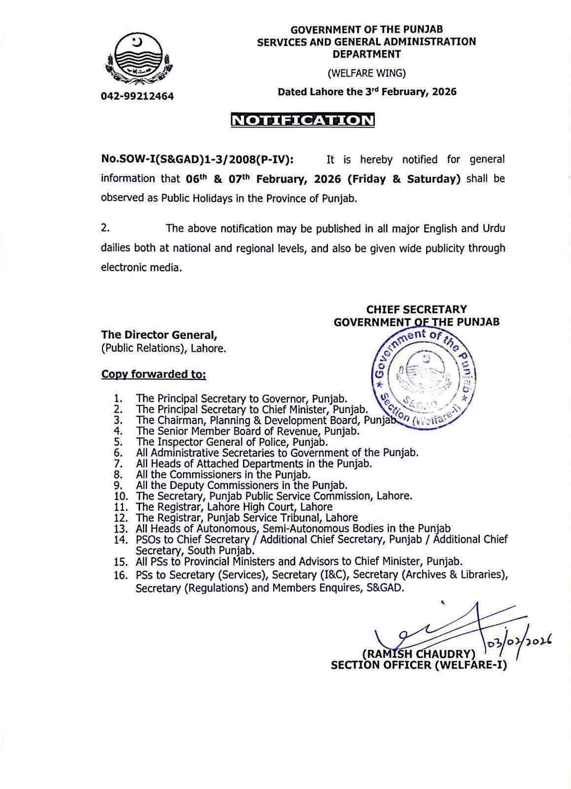 اس کے علاوہ، پنجاب حکومت نے بسنت کے تہوار کی مناسبت سے 6، 7 اور 8 فروری کو بھی تعطیلات کا اعلان کیا ہے۔ یہ تعطیلات بسنت کے حوالے سے اہمیت رکھتی ہیں کیونکہ لاہور اور دیگر پنجاب کے شہر ہر سال اس تہوار کو جوش و جذبے سے مناتے ہیں۔